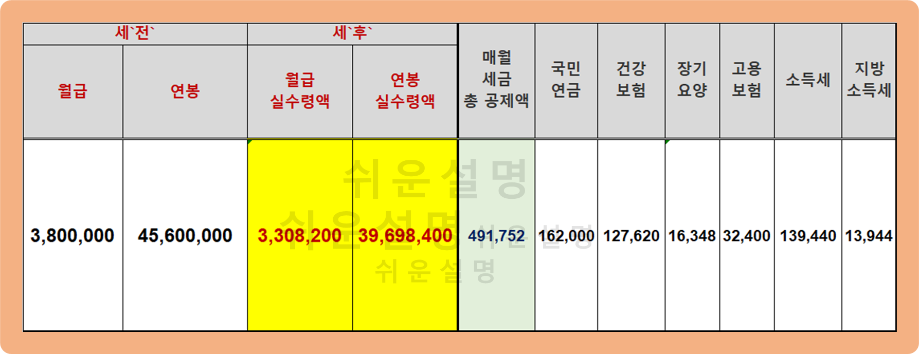 세전 월급 380만원(세전 연봉 4,560만원)일 경우 실수령액 알아보기.
