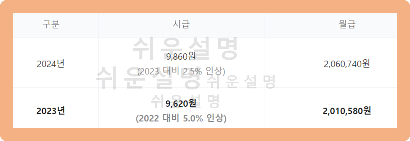 2023년 최저시급은 9,620원이며, 월급으로 환산할 경우 약 201만원이 돼요. 그리고 2024년 최저시은 9,860원으로 결정되었으며, 월급으로 환산할 경우약 206만원이 돼요.