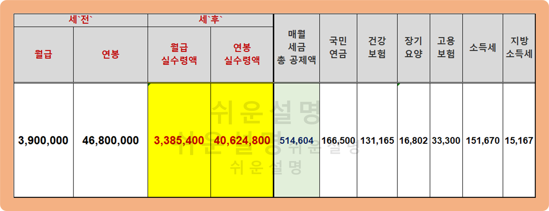 세전 월급 390만원(세전 연봉 4,680만원)일 경우 연봉 실수령액 알아보기.