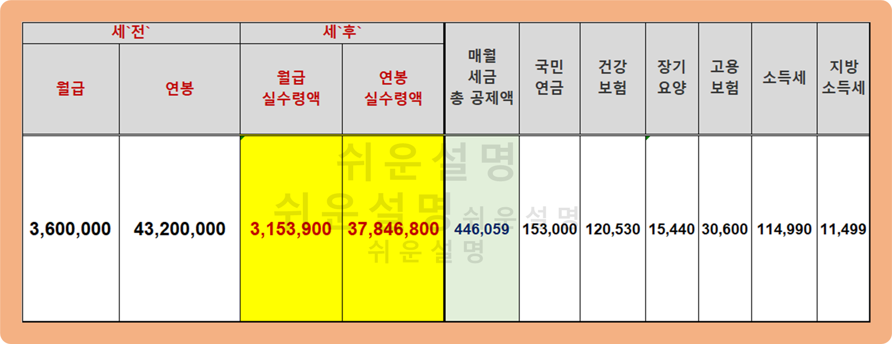 세전 월급이 360만원(세전 연봉 4,320만원)일 경우 실수령액 정보를 알아볼게요.