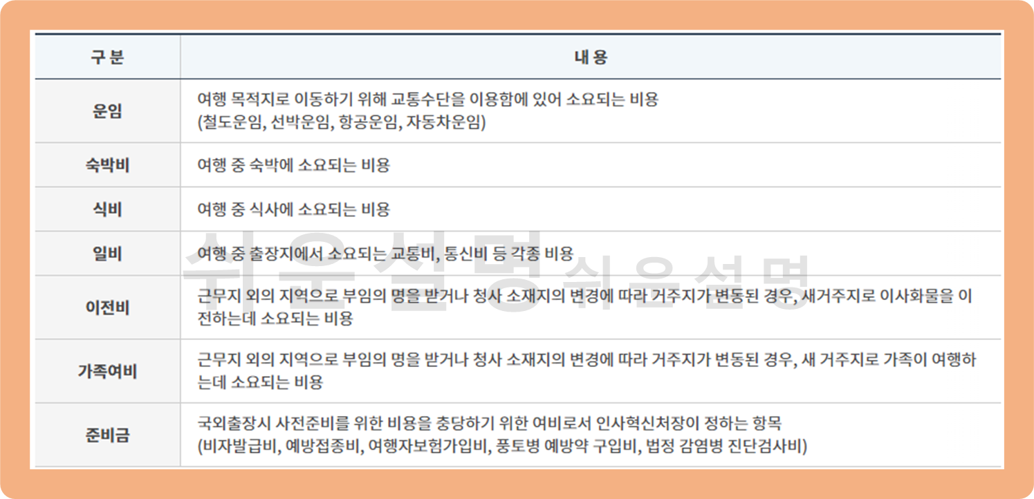 - 숙박비, 식비, 일비 : 여행중 숙박, 식사 등의 비용