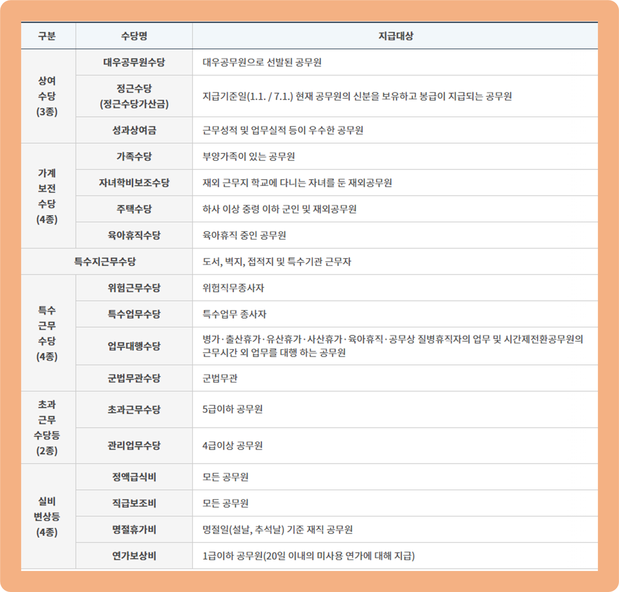 2. 가계보전 : 부양가족이 있는 공무원에게 지급되는 수당