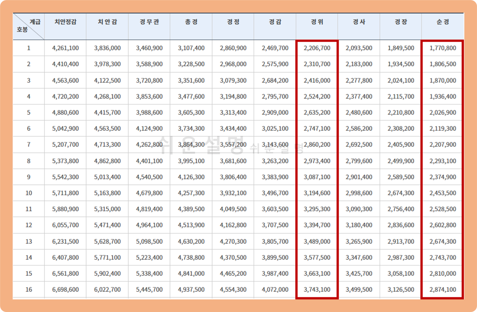 그리고 경위 1호봉 월급은 약 220만원이며, 실수령액은 약 199.6만원이네요. 기타 계급 및 호봉별 월급은 봉급표를 확인해주시면 돼요.
