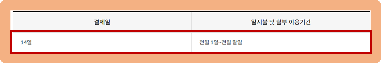 - 결제일 14일로 설정할 경우 이용 기간 : 전월 1일부터 전월 말일까지