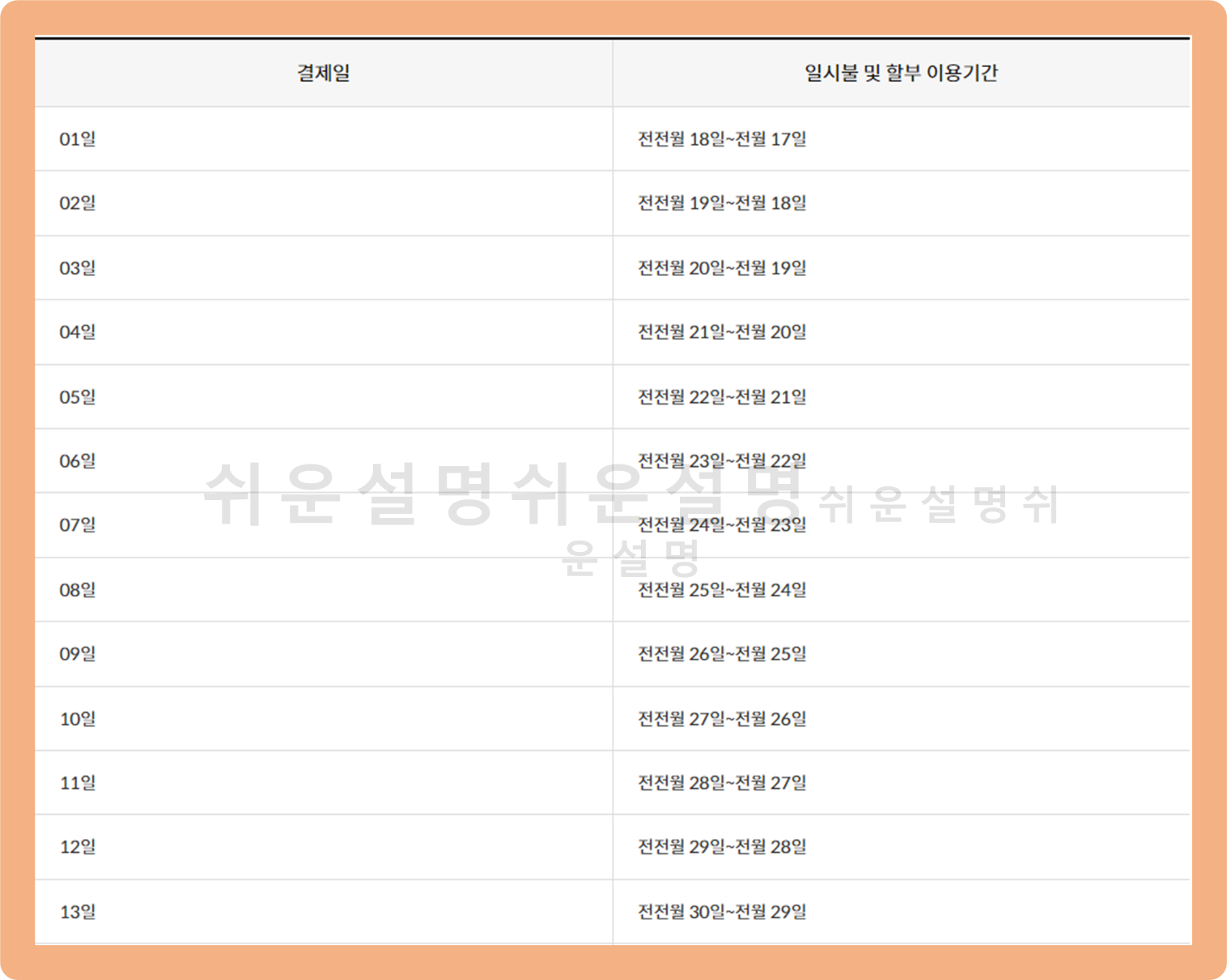 매월 1~13일 결제일별 이용기간에 대해 먼저 알아볼게요.