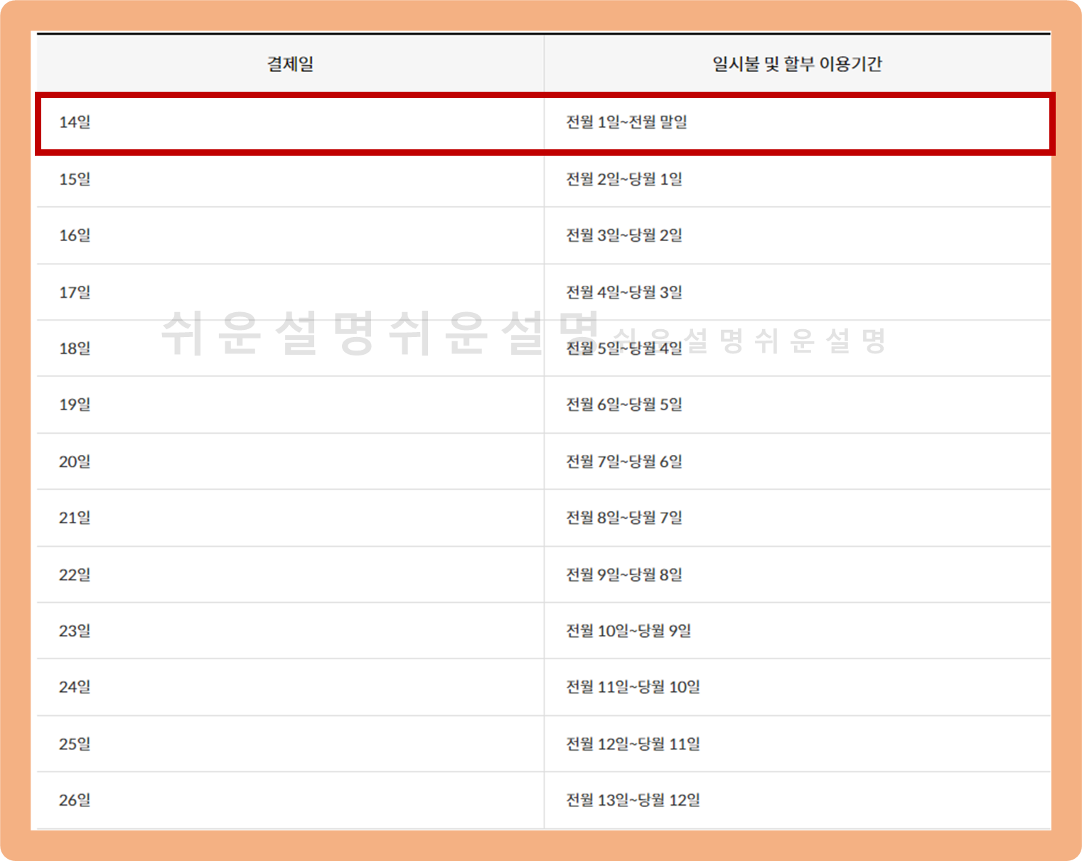 매월 14일~26일 결제일별에 이용기간을 샆펴볼게요.