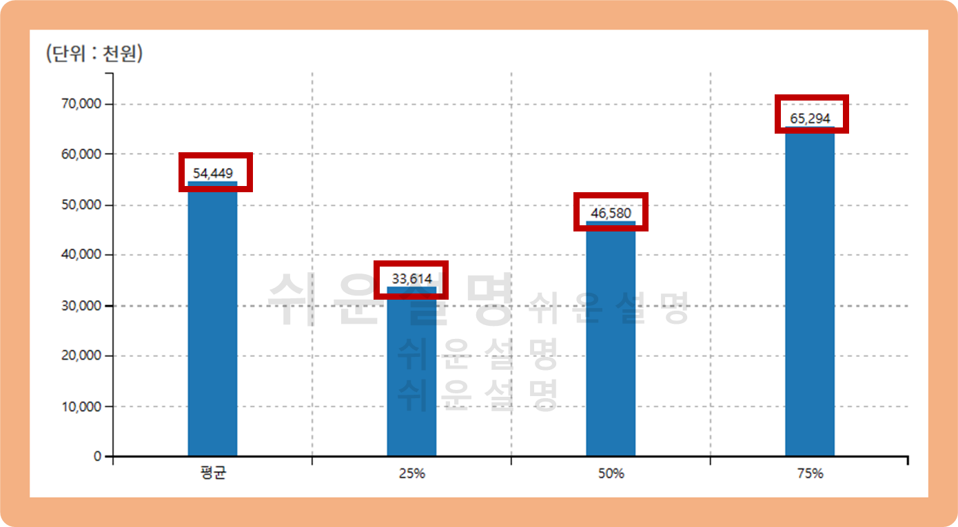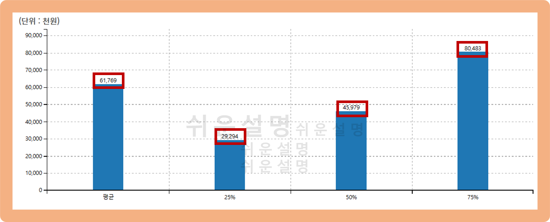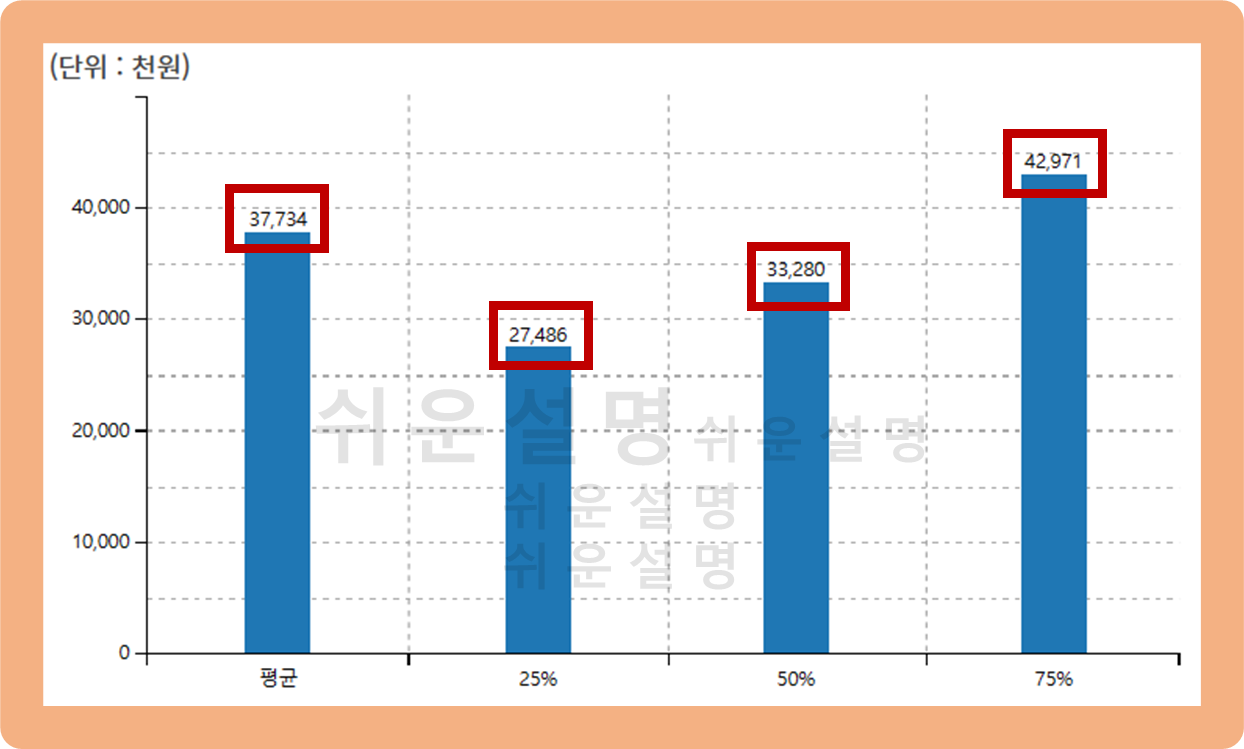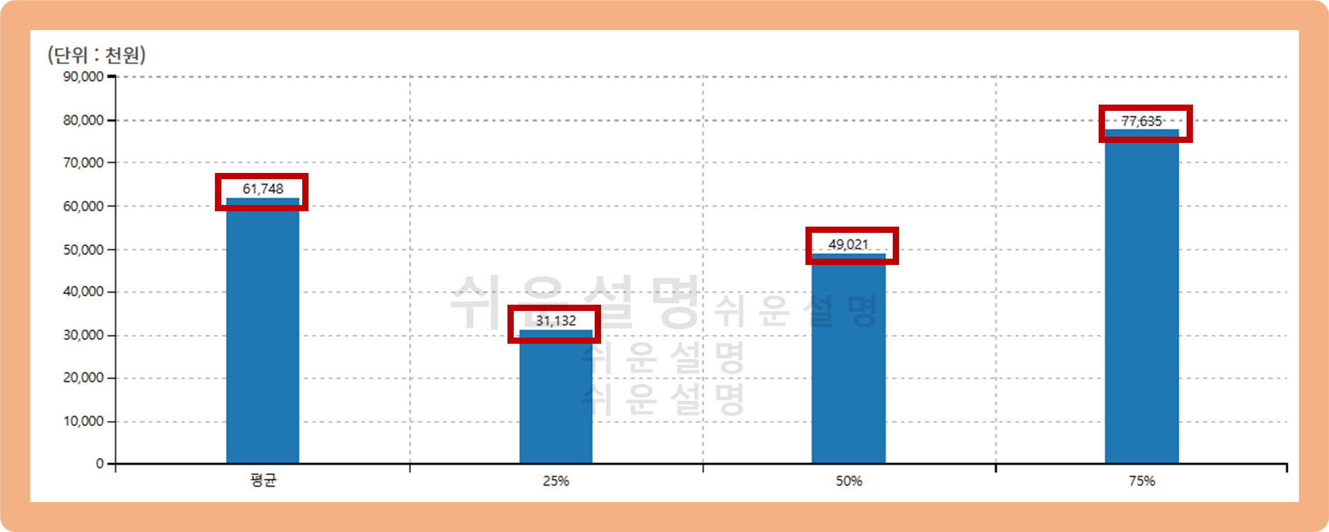 ※표에 기재되어 있는25%, 50%, 75%란, 해당 연령별 급여를 순서대로 나열했을 때 하위 25%, 중위 50%, 상위 75% 값을 뜻함