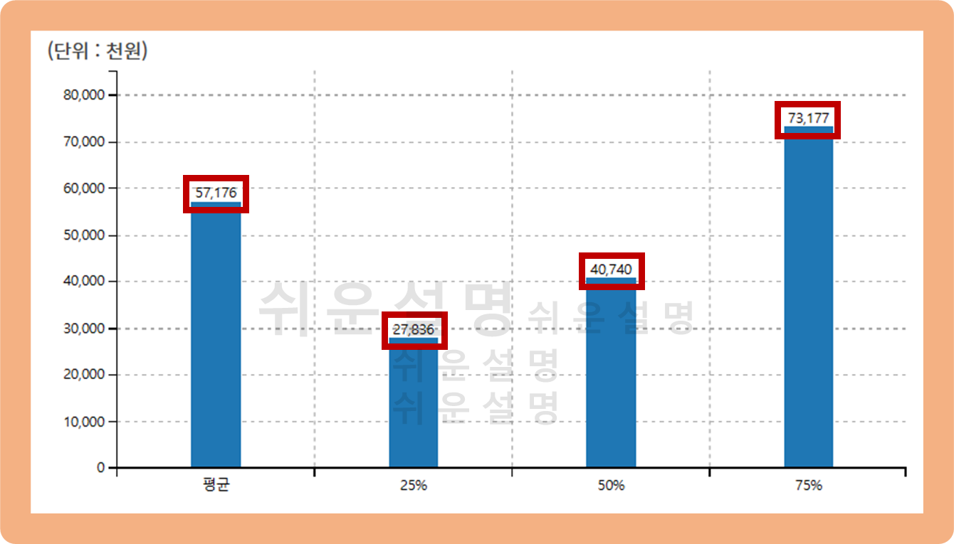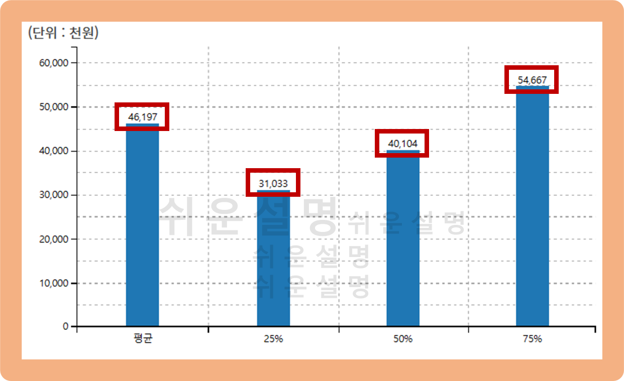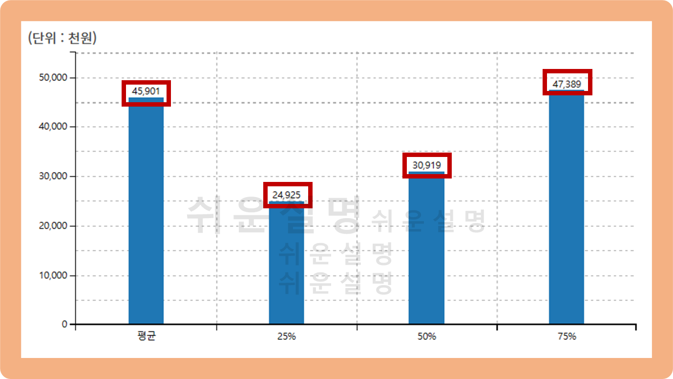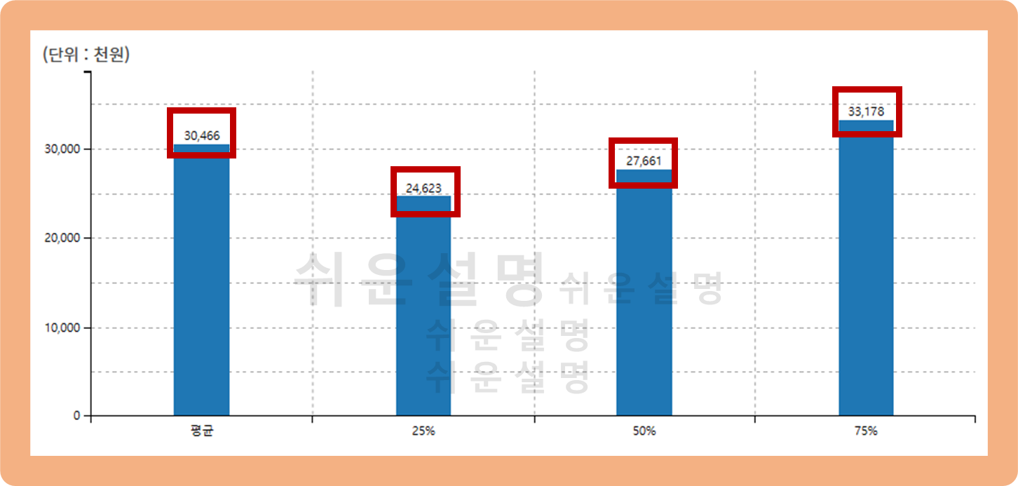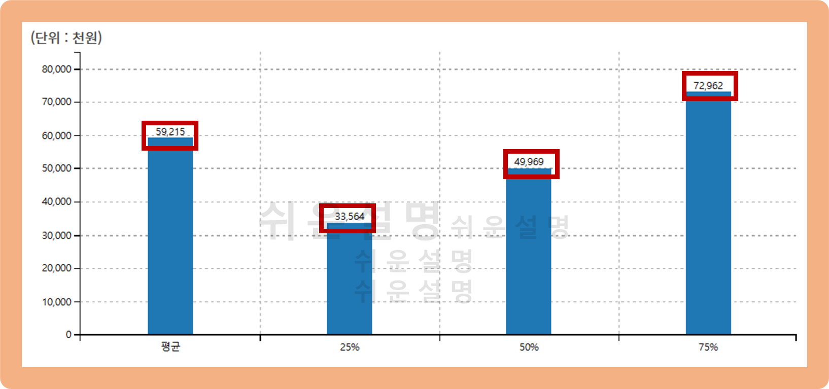 ※표에 기재되어 있는25%, 50%, 75%란, 해당 연령별 급여를 순서대로 나열했을 때 하위 25%, 중위 50%, 상위 75% 값을 뜻함