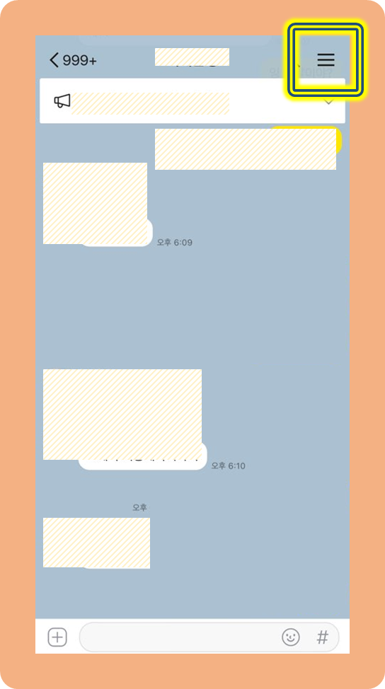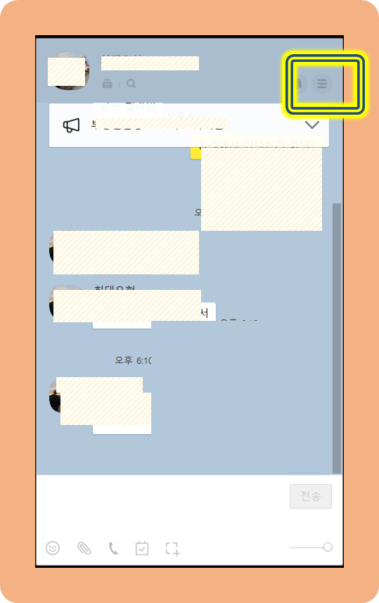 방으로 들어오셨으면 채팅방 오른쪽 상단 모서리에 있는 스틱 3개를 클릭하세요.