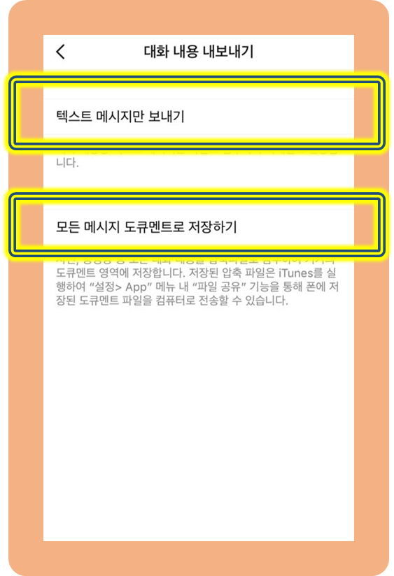 1. 텍스트 메시지만 내보내기 : 대화 내용만 메모장 파일로 내보냅니다. 이메일 등으로 받아볼 수 있어요.