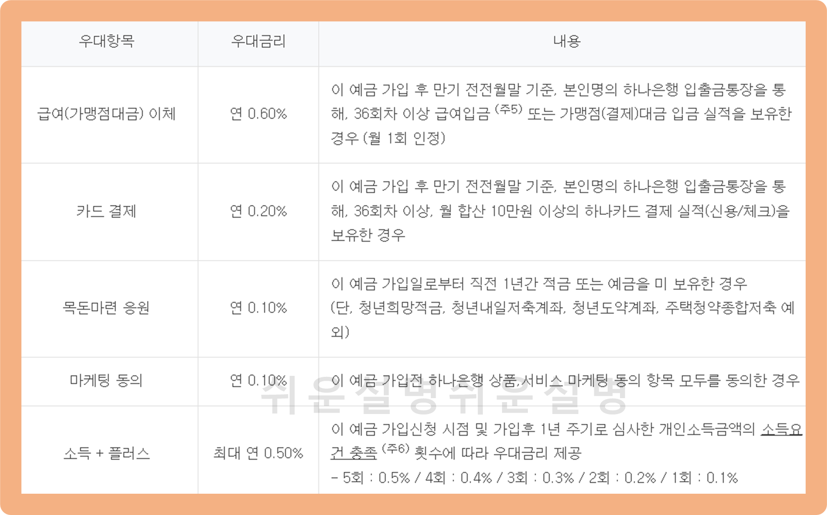 - 급여 이체(0.6% 우대금리 제공) : 하나은행 통장을 통해 36회(36개월) 이상 급여 입금 또는 결제 실적이 있는 고객