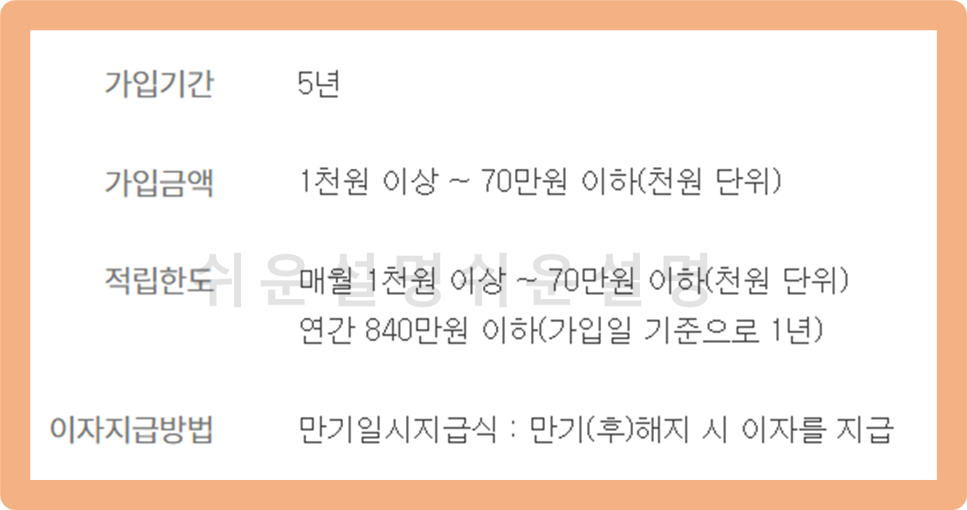 가입 기간은 5년이으로 정해져 있으며, 약정 금액은 매월 1천원 이상부터 최대 70만원까지 신청할 수 있어요. 1년으로 환산할 경우 연간 최대 840만원까지 납입 가능한 것이죠.