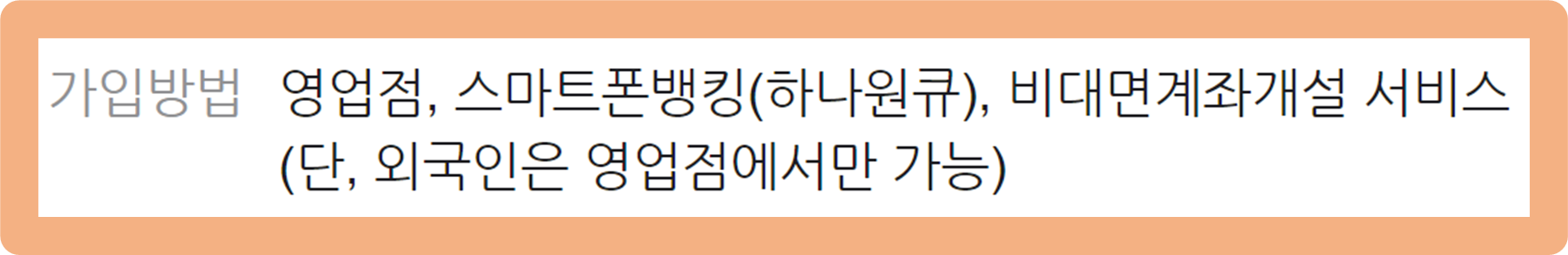 영업점 직접 방문, 스마트폰뱅킹(하나원큐 이용), 비대면계좌개설 서비스를 통해 가입 및 계좌 개설이 가능해요.(다만, 외국인은 은행 영업점에 직접 방문해야만 가입할 수 있어요.)