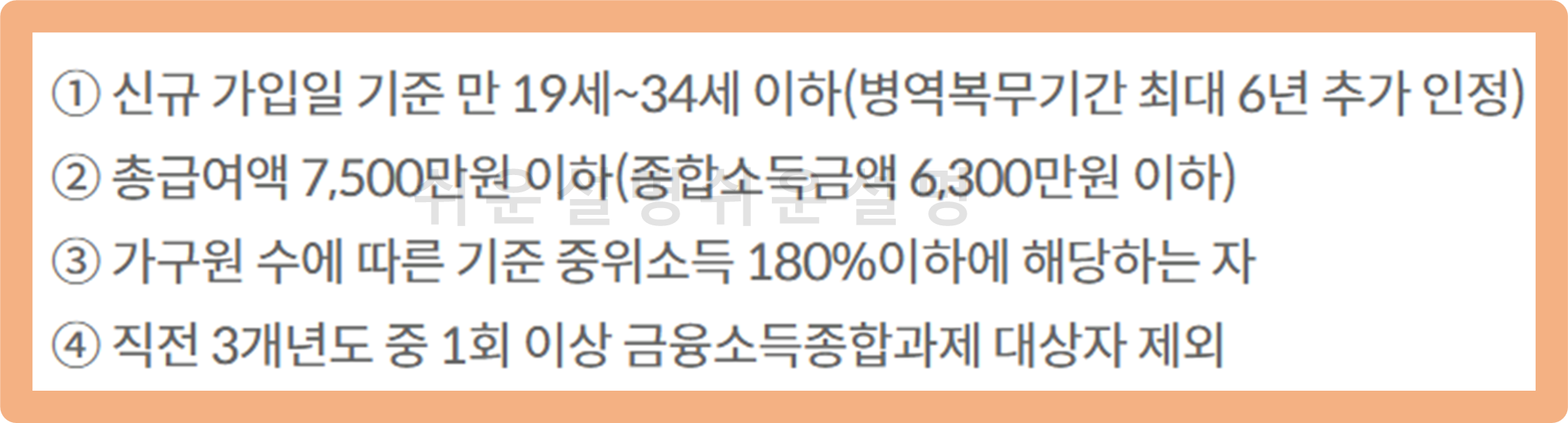 첫번째. 가입일 기준 만 19세~34세 이하여야 돼요.(병역 이행을 증명할 경우 최대 40세까지 신청할 수 있어요.)
