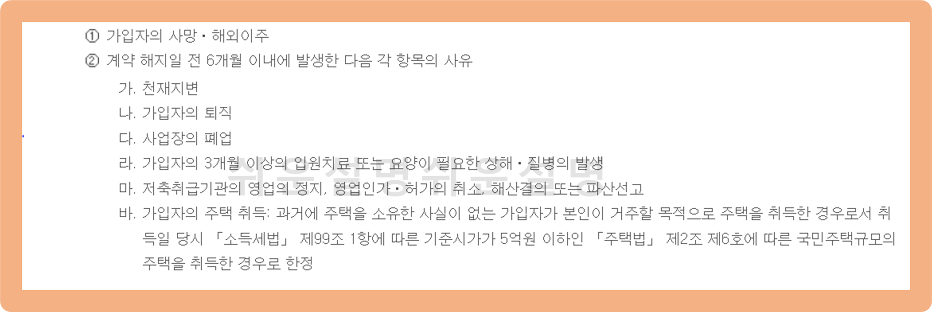 만약 가입 기간 내에 중도해지를 하게 되면, 약정 금리 혜택을 받지 못하게 되는데요. 예외적으로 아래 특별중도해지 사유에 해당하는 경우 약정 금리 및 정부기여금을 받을 수 있어요.