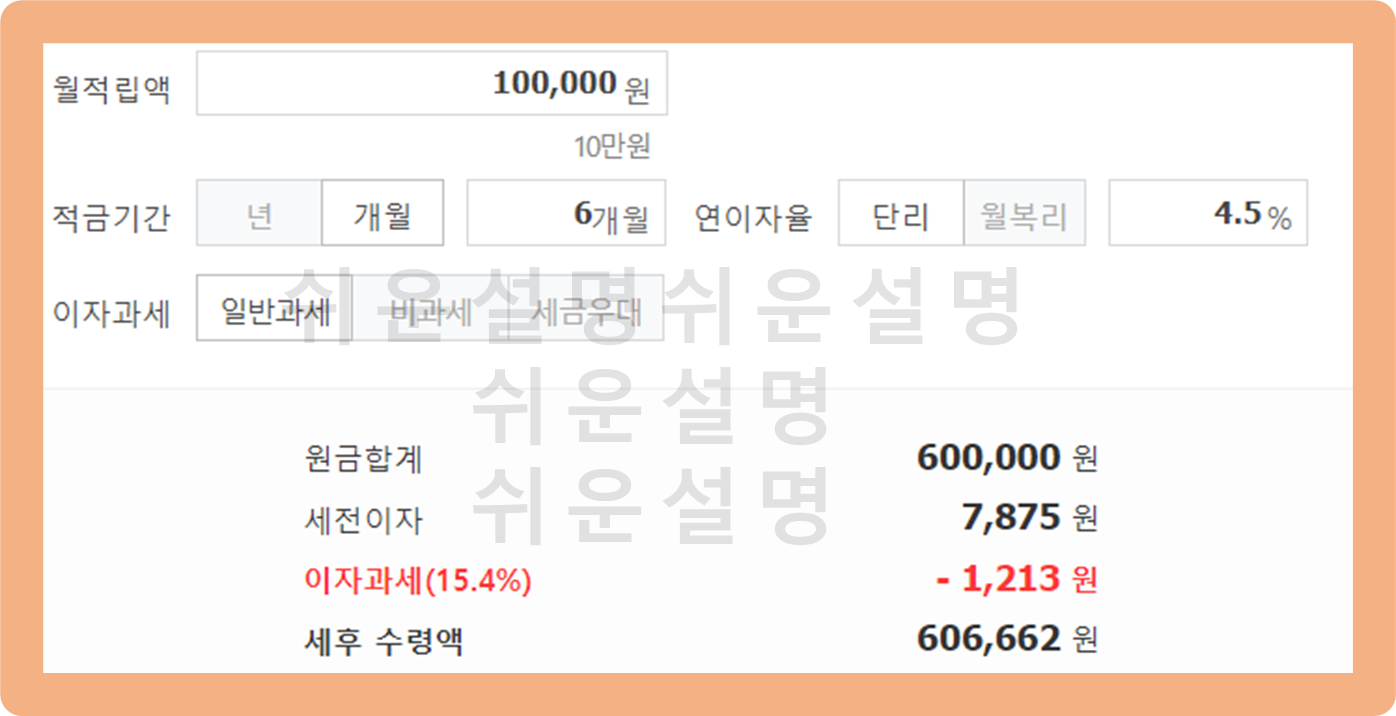 총 6개월 동안 매월 10만원을 납입할 경우 세전 이자는 7,875원이며, 세금이 제외된 세후 이자 수익 6,662원을 받을 수 있어요.