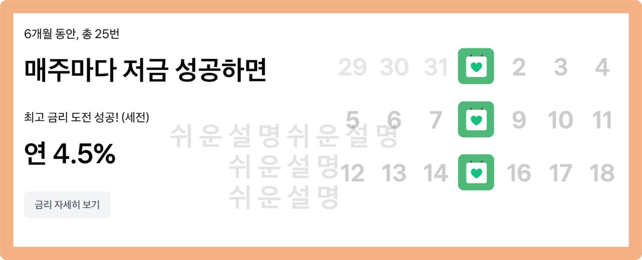 키워봐요 적금이란, 총 6개월 간 빠짐없이 총 25번 자동이체를 통해 납입을 성공하기만 하면 연 4.5%의 금리 혜택을 제공해주는 적금 상품이에요.