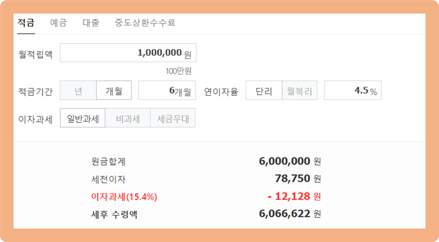 6개월 동안 매월 최대 납입 금액인 100만원씩 납입할 경우에는 세후 이자 수익 66,622원을 받게 돼요. 족발을 2번 먹을 수 있겠네요.