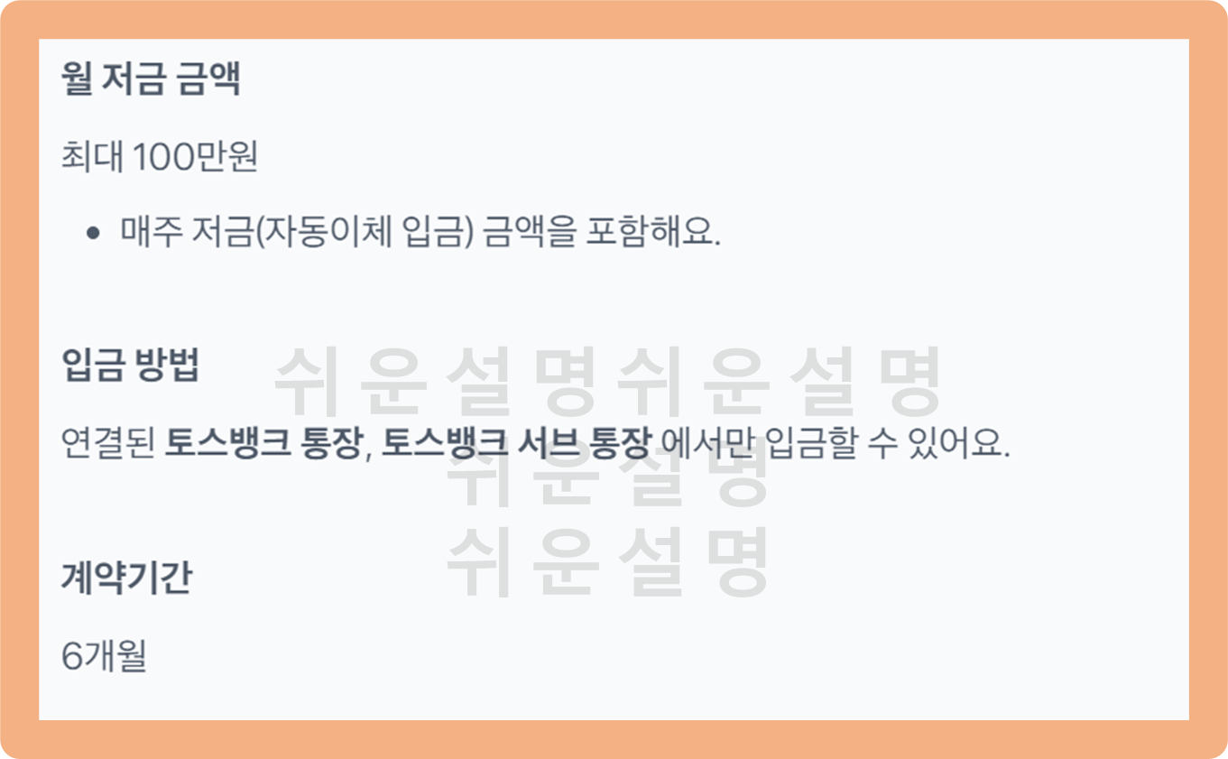 그리고 가입 기간은 6개월이며, 연결되어 있는 토스뱅크 통장(서브 통장)을 통해 납입하시면 돼요.