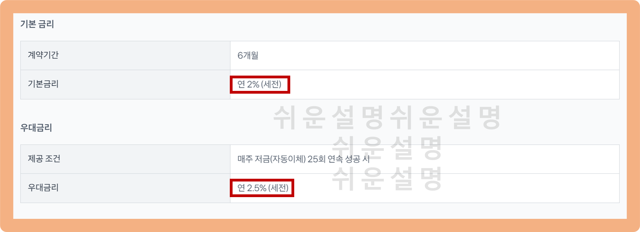 앞서 설명드렸던 것처럼 총 25주 동안 1번도 빠짐없이 납입을 할 경우, 2.5%의 추가 우대금리가 적용되어 총 4.5%의 금리 혜택을 받을 수 있어요. 조건이 비교적 간단하기 때문에, 돈만 꾸준하게 통장에 채워놓으면 조건을 충족하는 게 어렵지 않아보이네요.