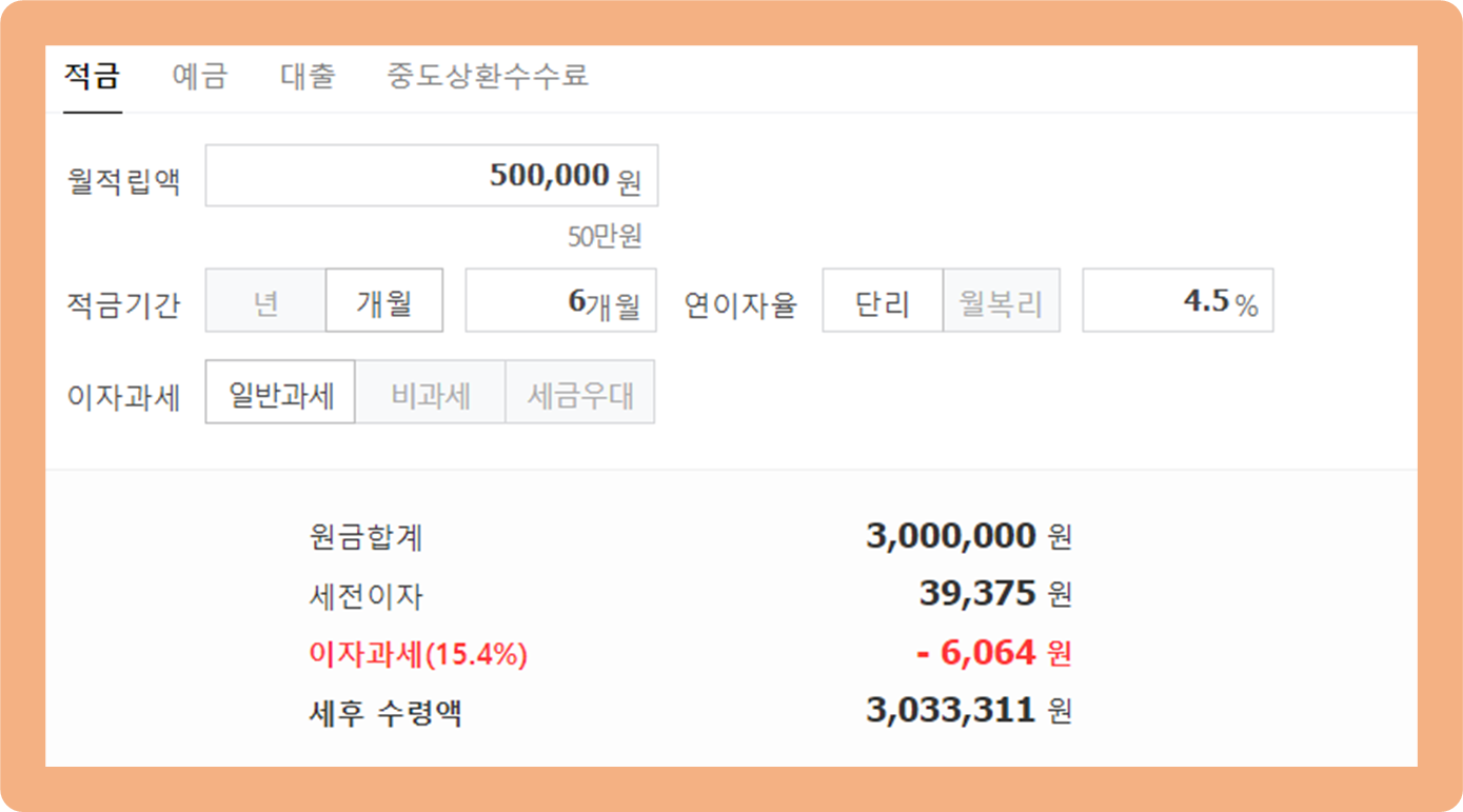 6개월 간 매월 50만원 씩 납입할 경우 만기 해지 시 세전 이자는 39,375원이며, 세후 이자 수익은 33,311원을 받게 돼요. 이 정도면 족발까지 먹을 수 있게 되죠.