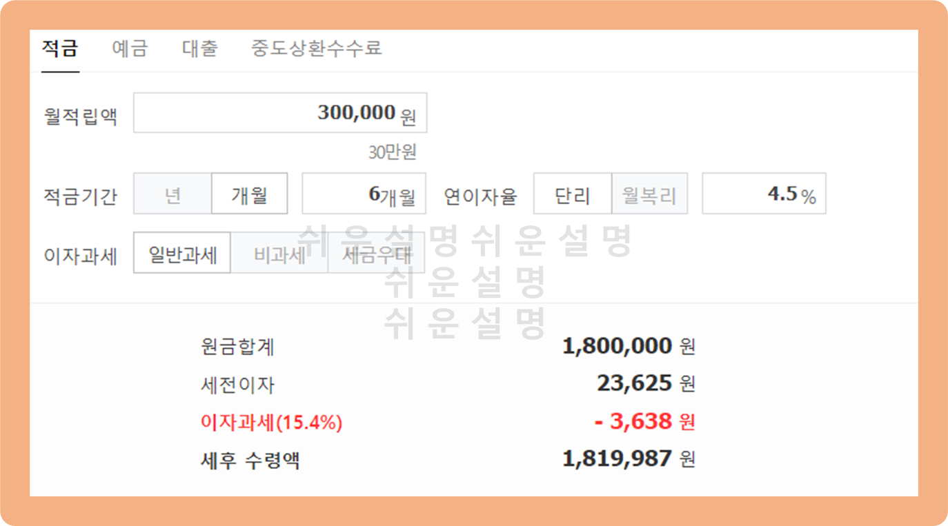 6개월 동안 매달 30만원을 납입할 경우 만기 시 이자 수익은 어떻게 될까요? 이 경우 세전 이자는 23,625원이며, 세금을 제외한 세후 이자 수익은 19,987원을 받게 돼요. 치킨 1마리 사먹을 수 있어요.