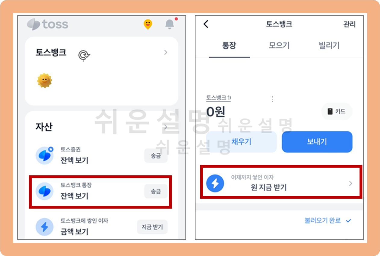어플 실행 후 '토스뱅크 통장' 메뉴에 들어가면, '어제까지 쌓인 이자, xx원 지금받기' 버튼을 클릭해 이자를 바로 받을 수도 있죠.