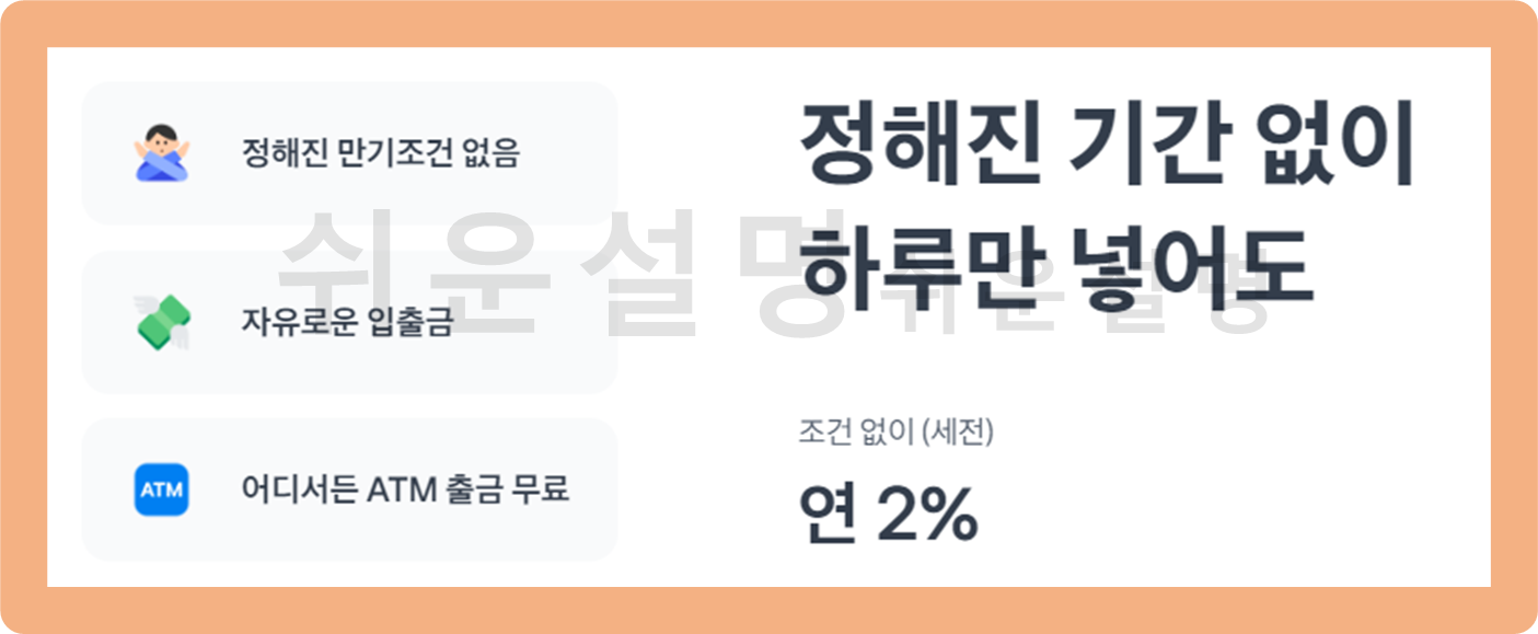 그리고 하루마다 지급되는 이자는 연 금리 2%를 하루 단위로 계산해 자동으로 지급해주기 때문에, 굳이 귀찮게 따로 계산할 필요는 없어요.