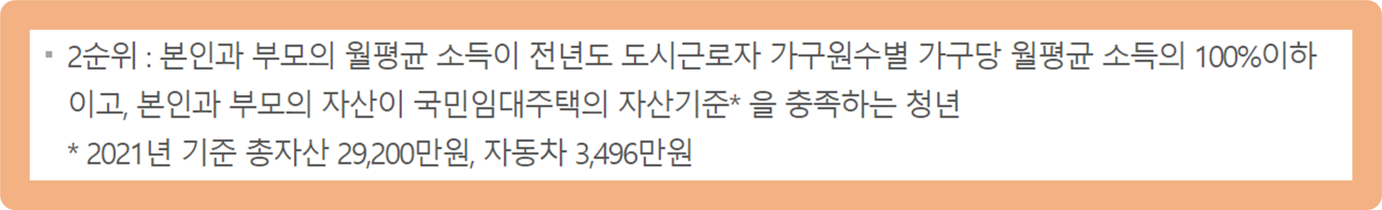 - 2순위 자격 조건 : 신본인과 부모의 월평균 소득이 전년도 도시근로자 가구당 월평균 소득의 100%이하 및 본인과 부모의 자산이 국민임대주택의 자산 기준을 충족하는 자.