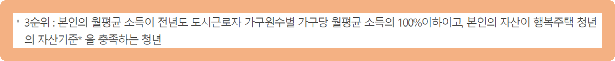 - 3순위 자격 조건 : 본인의 월평균 소득이 전년도 도시근로자 가구당 월평균 소득의 100%이하임을 충족하며, 이와 동시에 본인의 자산이 행복주택 청년의 자산기준을 충족하는 자.