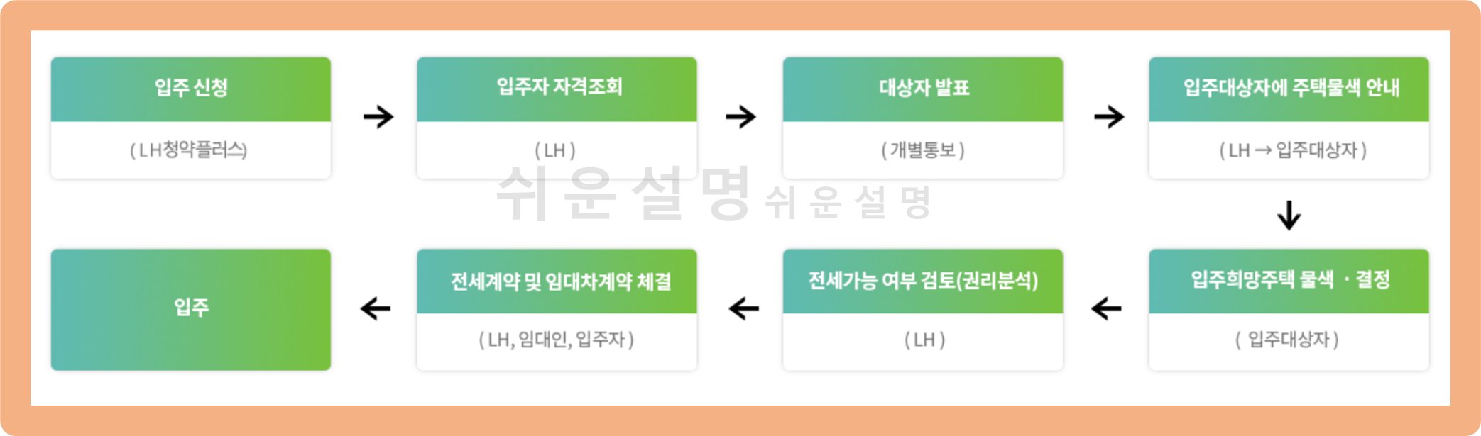 신청을 원하는 분들을 위해 신청방법을 알아볼게요. 신청방법은 'LH청약센터' 인터넷 공식 홈페이지를 통해 청약 접수 ▶ 자격 조회 진행 ▶ 당첨자 발표 ▶ 주택 물색 ▶ 희망하는 주택 선택 ▶ 전세 계약 가능 여부 검토 ▶ 전세 및 임대차 계약서 작성 ▶ 주택 입주 순으로 진행해주시면 돼요.