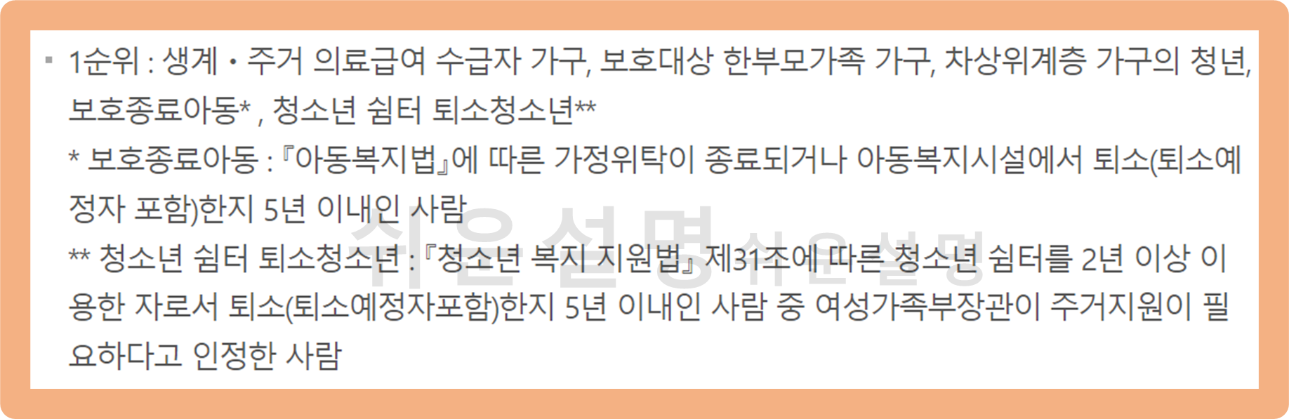 - 1순위 자격 조건 : 생계급여 및 주거 의료급여 수급자 가구, 차상위계층 가구의 청년, 보호 종료 아동, 보호대상 한부모가정 가구, 청소년 쉼터 퇴소 청소년 중 1가지를 충족하면 1순위에 해당돼요.