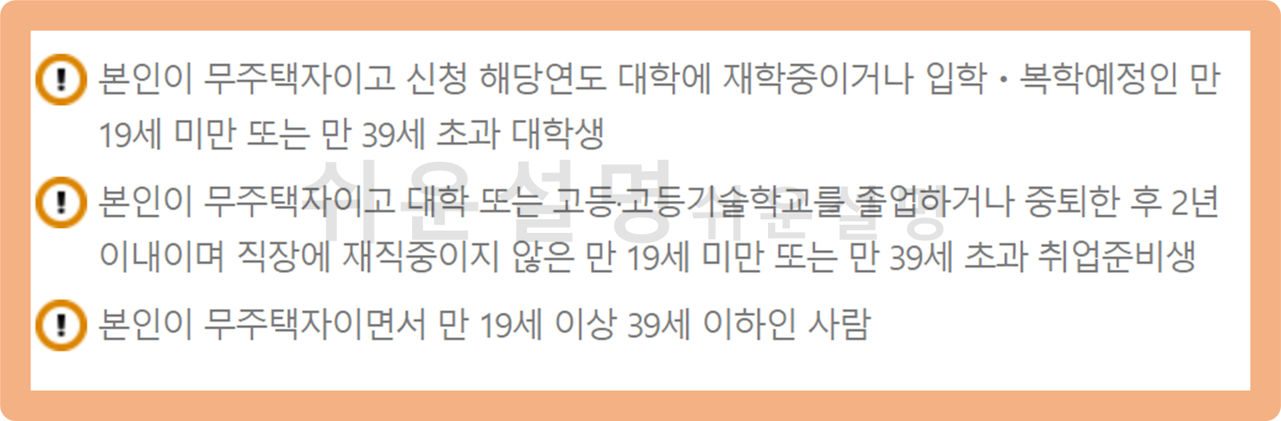 1. 본인이 무주택자임과 동시에, 신청하는 연도 기준 대학교에 재학중이거나 입학 또는 복학이 예정된 만 19세 미만인 자 또는 만 39세를 초과하는 대학생