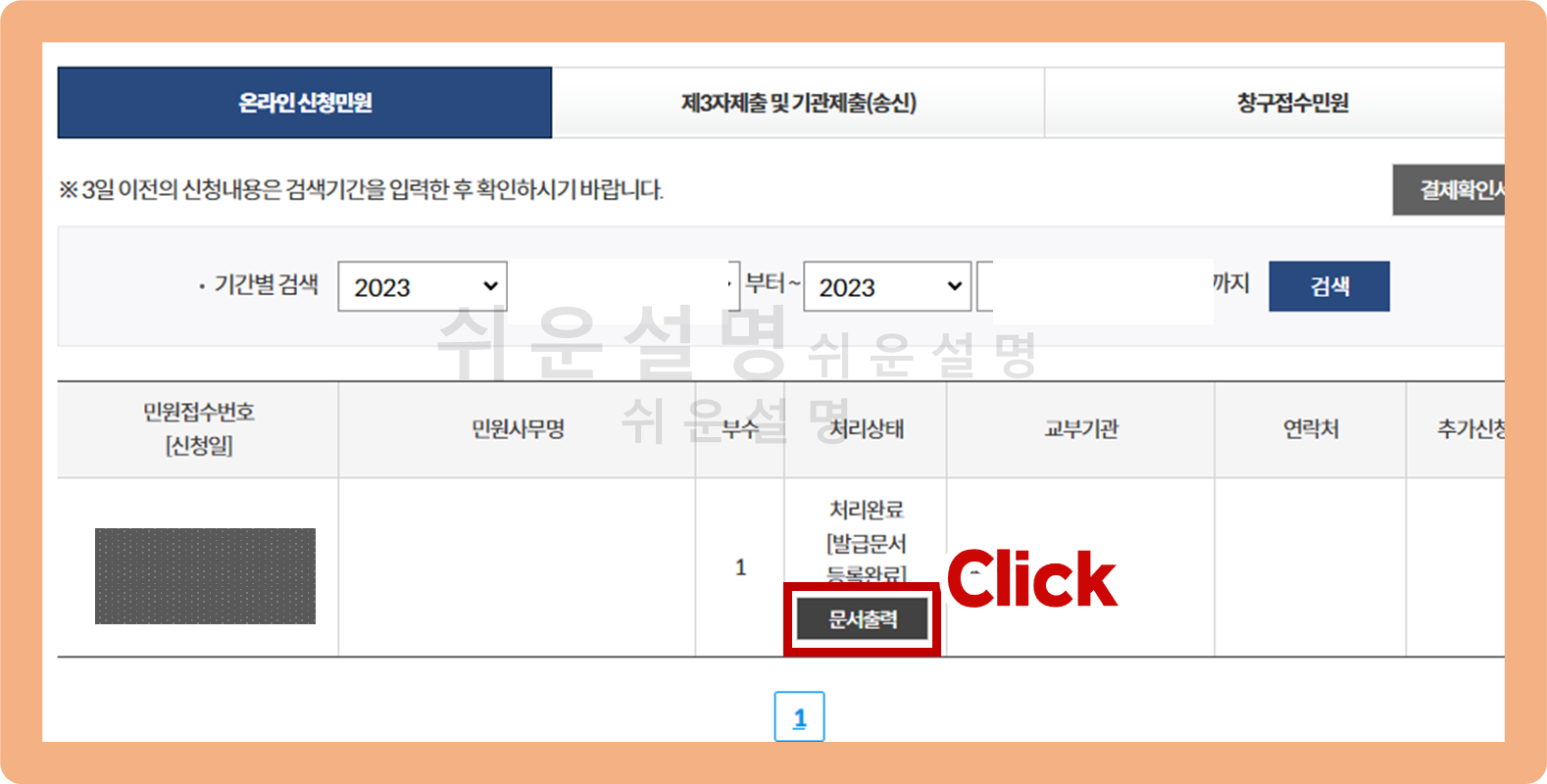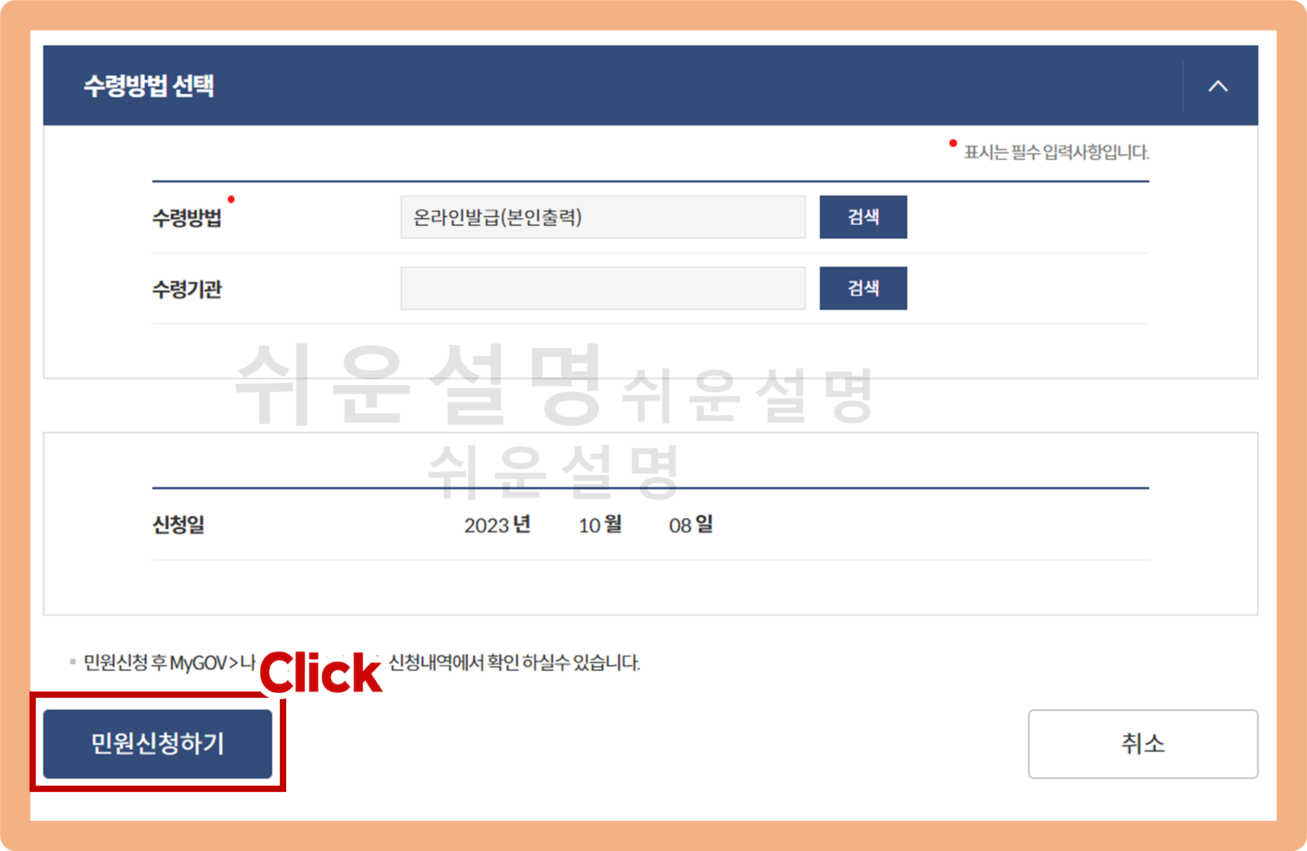 화면을 밑으로 내린 후 원하는 수령방법을 선택해주시면 돼요. 아마 온라인발급이 가장 편한 방법일거에요. 선택하셨으면, 왼쪽 아래에 보이는 '민원신청하기' 버튼을 클릭해주세요.