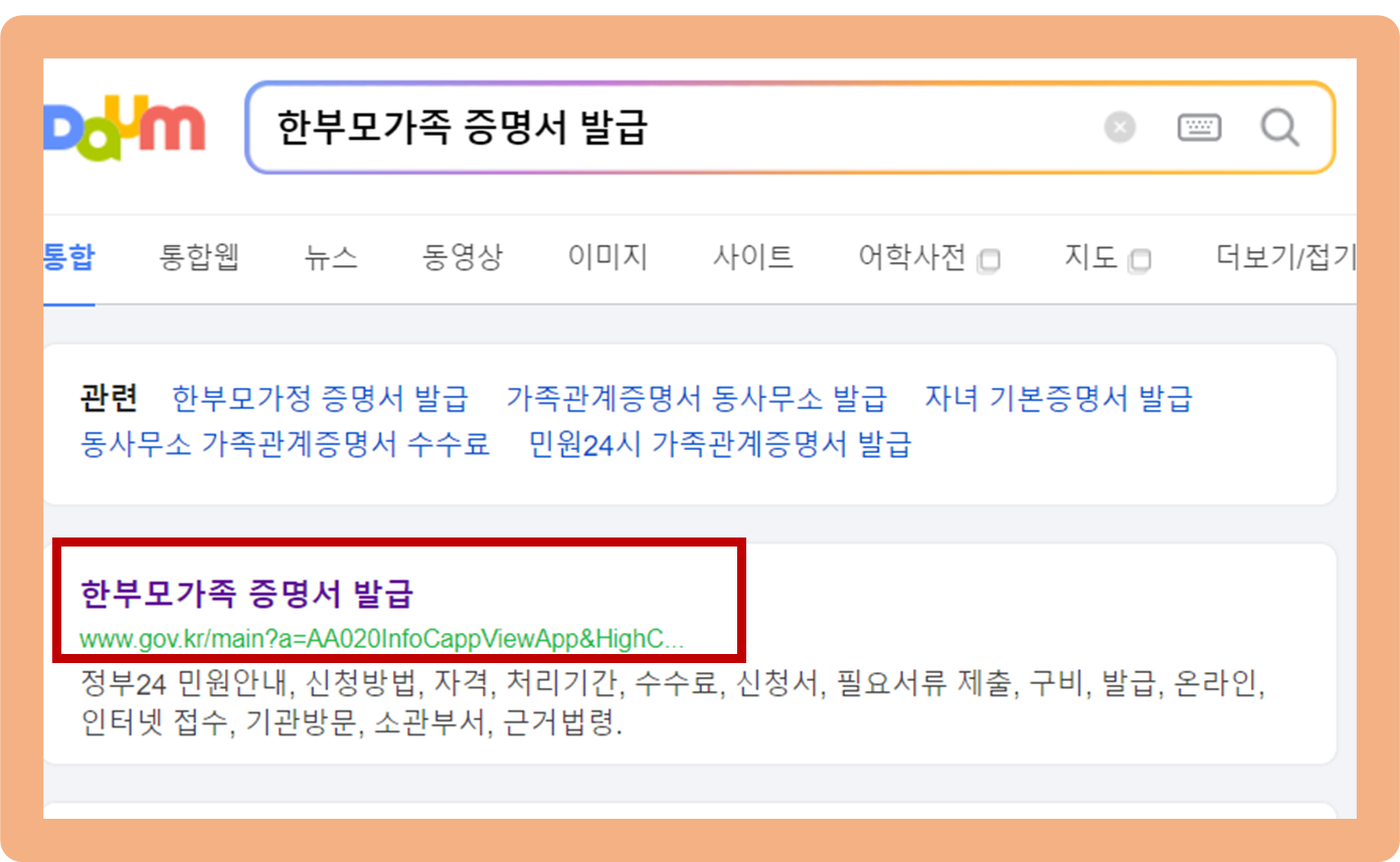 검색창을 통해 '한부모가족 증명서 발급'이라고 검색해주세요.