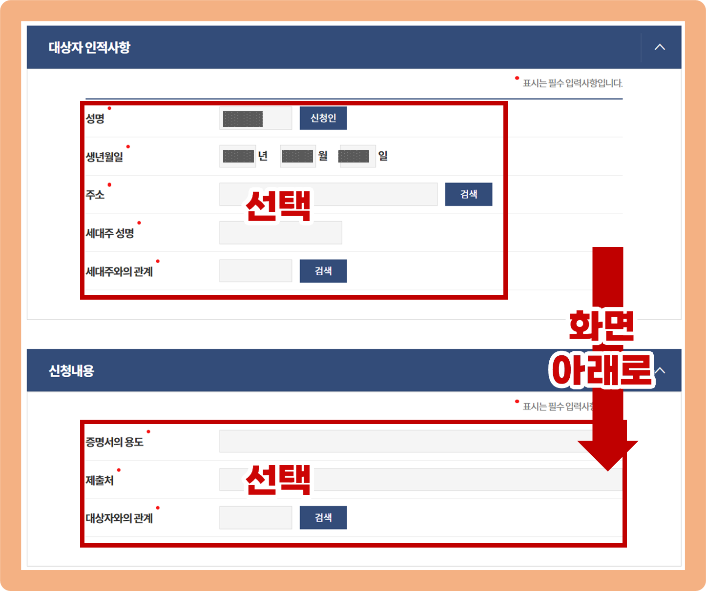그 다음 대상자의 성명, 생년월일, 주소 등의 인적사항을 입력하고, 증명서 용도 등을 입력해주세요.