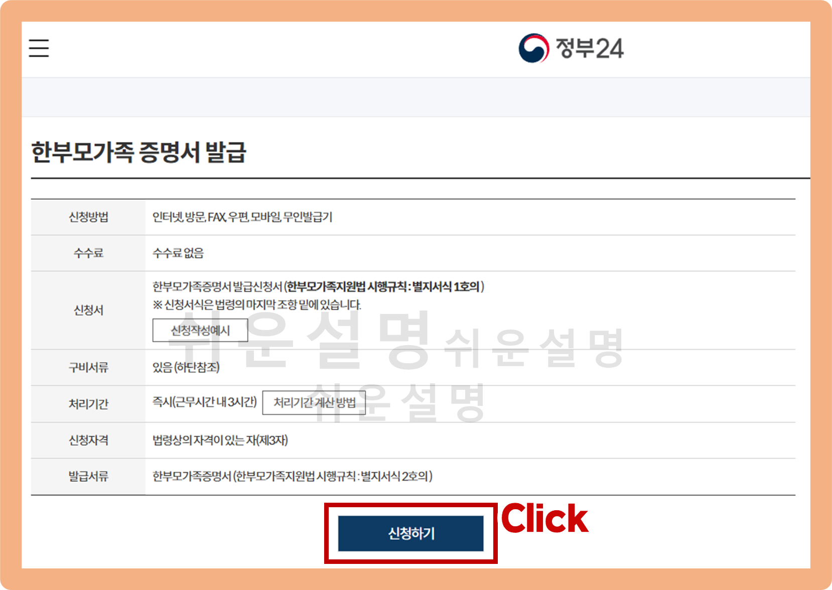 한부모가족 증명서 인터넷발급 - '신청하기' 클릭하기
