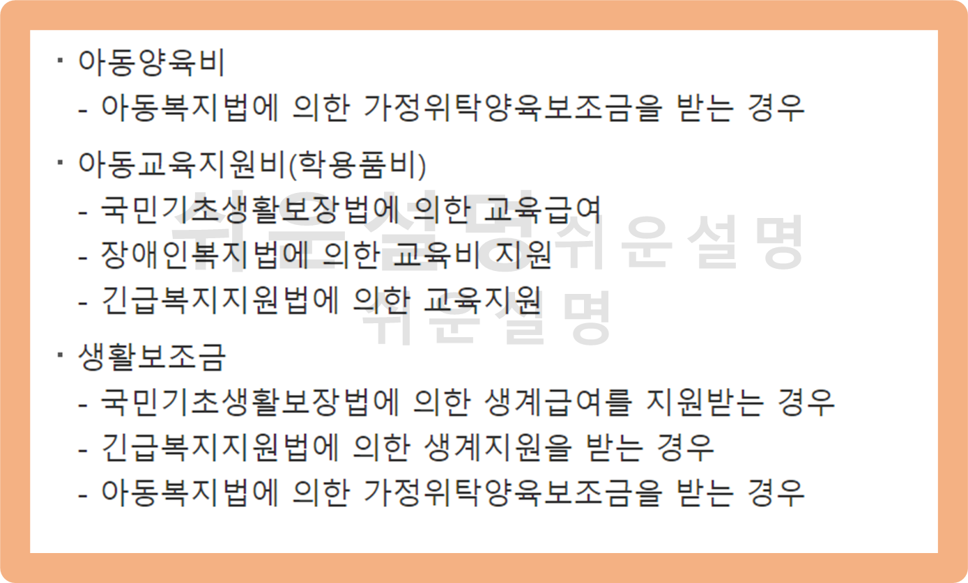 가정위탁양육보조금, 교육급여, 생계급여 등 다른 법에 의해 이미 양육비 및 생활보조금 등을 받고있는 경우에는 한부모가족 지원 혜택을 받을 수 없다는 점 참고해주세요.