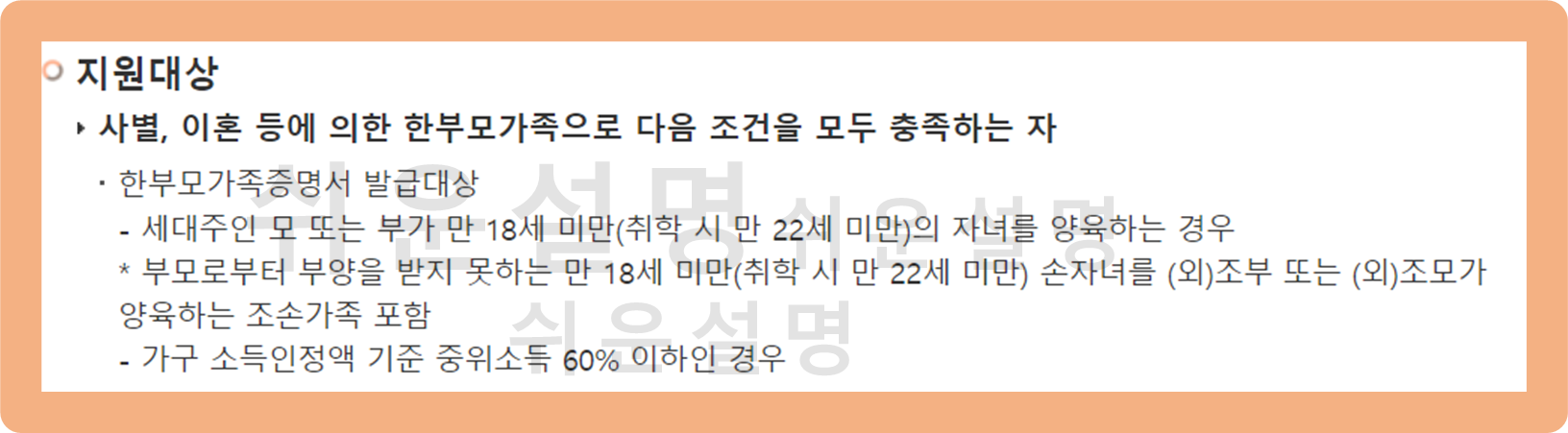 사별 및 이혼 등으로 인해 한부모가족이 된 가구 중 아래 두 가지 조건에 모두 해당되어야 해요. (만약 자녀가 부모님 대신 할아버지 또는 할머니의 부양을 받고 있는 경우에도 한부모가족 혜택을 받을 수 있어요.)