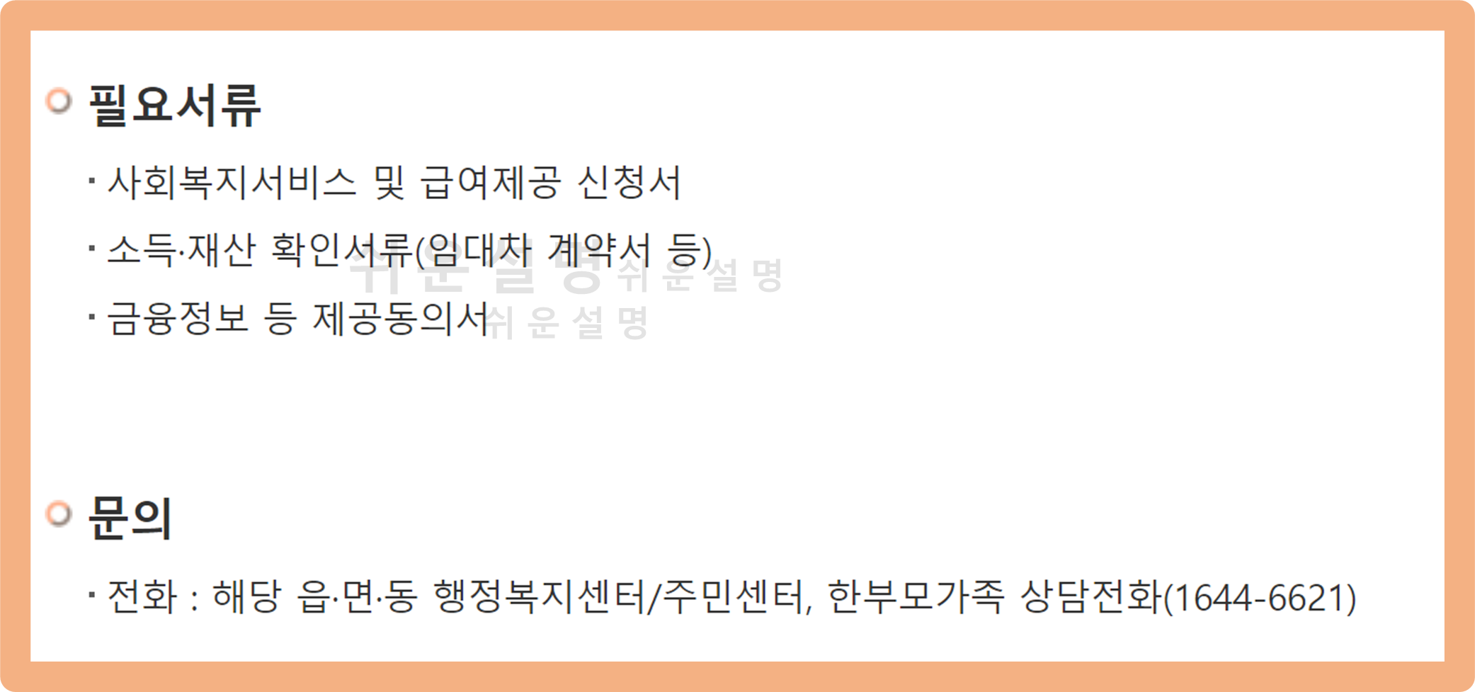 필요서류는 사회복지서비스 및 급여제공신청서, 각종 소득 및 재산 증빙 서류, 금융정보 등의 제공동의서를 준비하면 돼요 . 그리고 이에 대한 문의사항이 있으신 분들은 주소지 관할 행정복지센터에 전화하시거나 1644-6621에 전화하셔서 문의하시면 돼요.