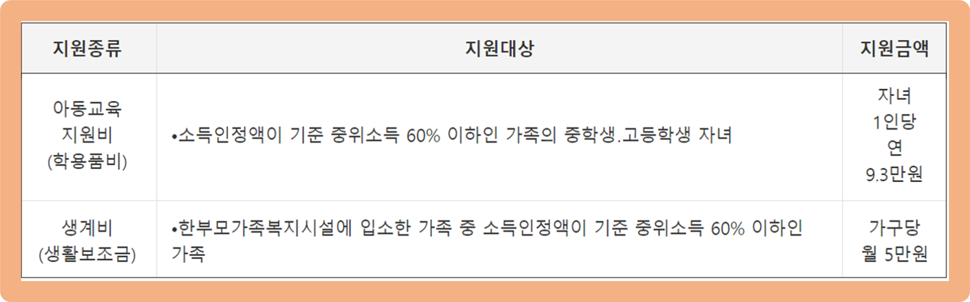 3번. 아동교육지원비 : 한부모가족 가구 내 중학생, 고등학생 자녀가 있을 경우 자녀 1인당 연 9.3만원 지원.