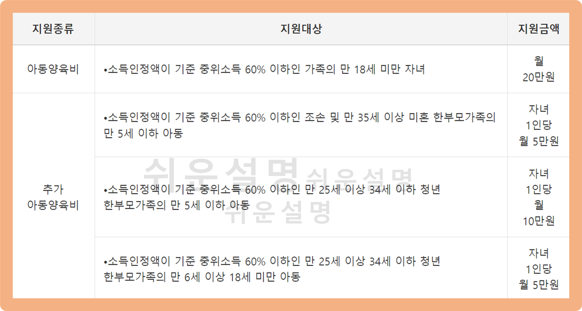 1번. 아동양육비 : 만 18세 미만 자녀가 있는 한부모가족 가구일 경우 매월 20만원 지원.