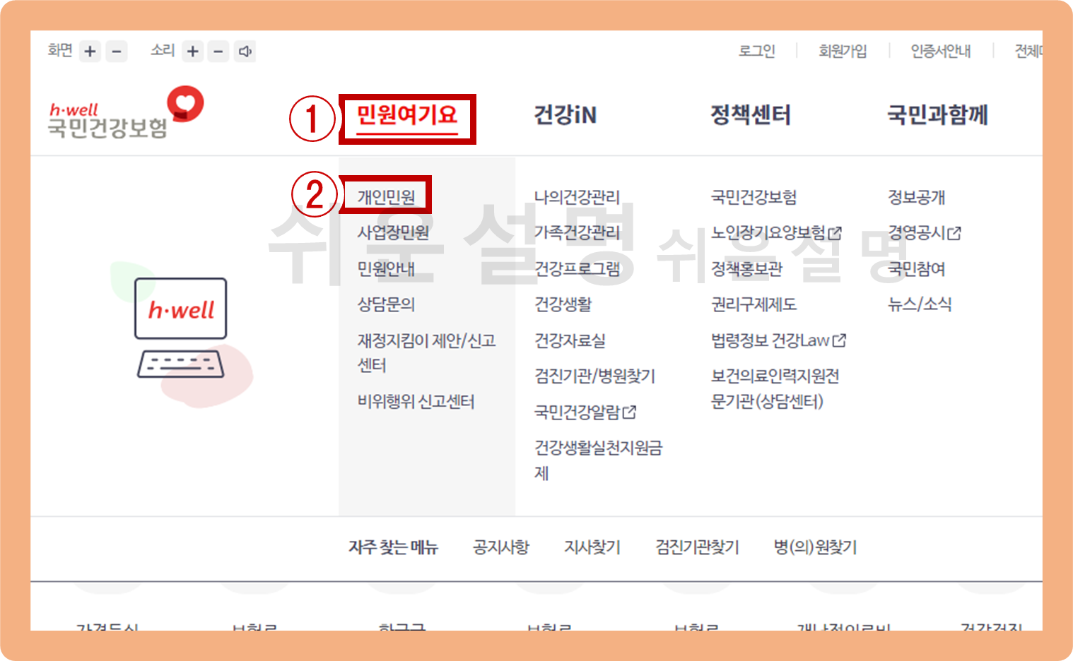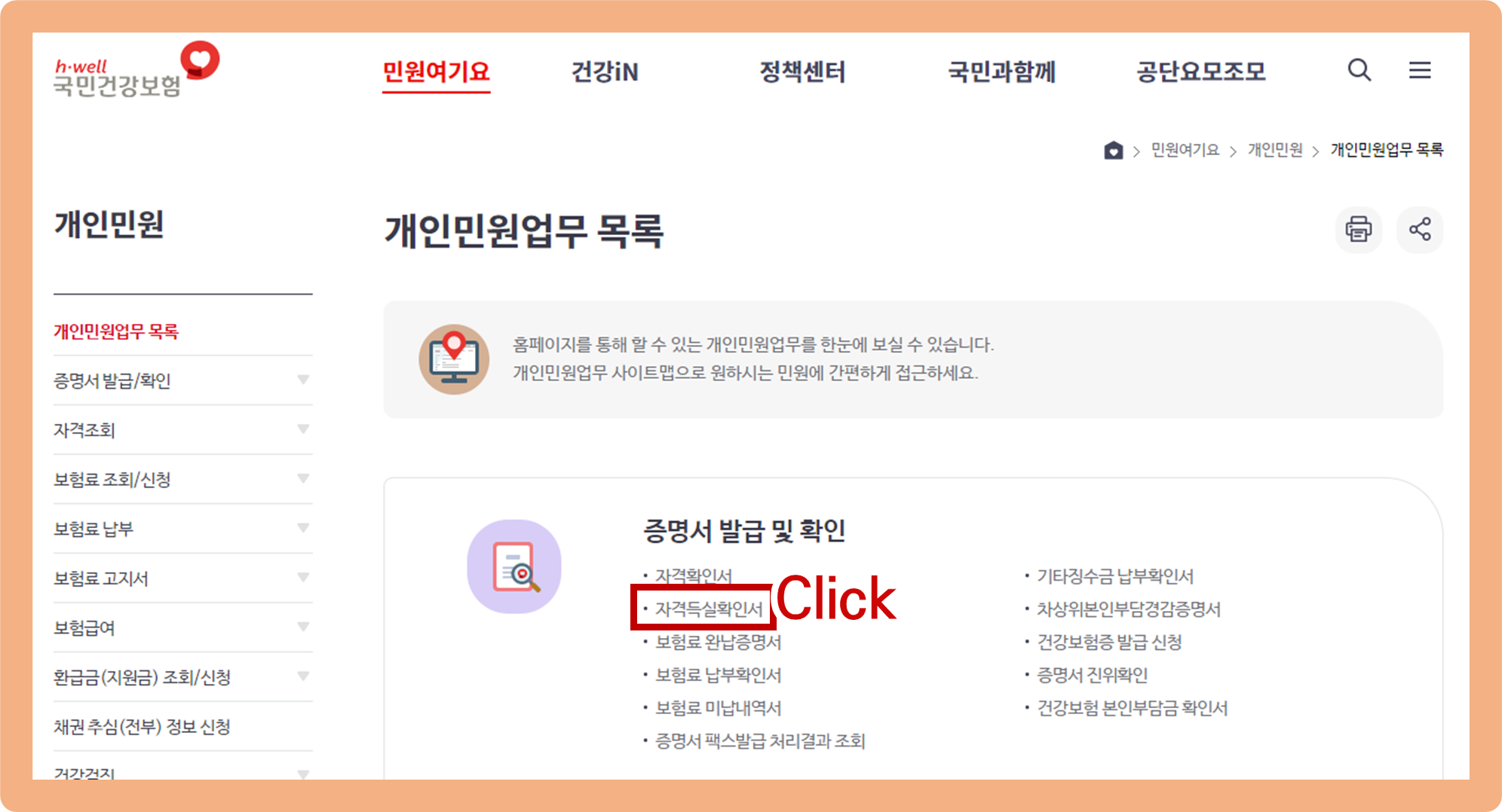 건강보험 자격득실확인서 인터넷 발급 방법 - '개인민원' 메뉴