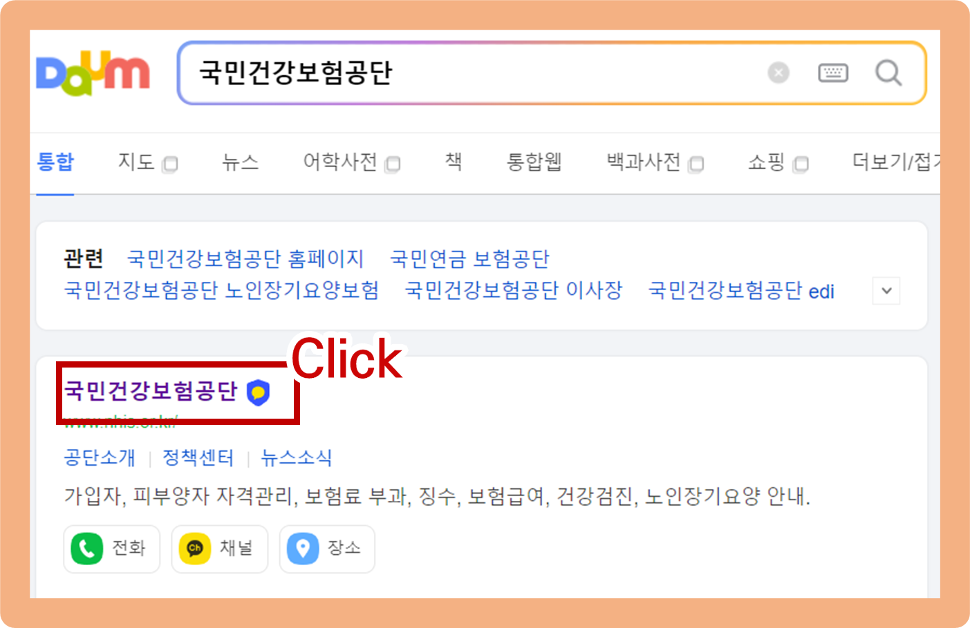 우선 검색창에 '국민건강보험'을 검색하면, 맨 위에 국민건강보험공단 홈페이지가 보여요. 이 곳을 눌러 접속해주시길 바랄게요.