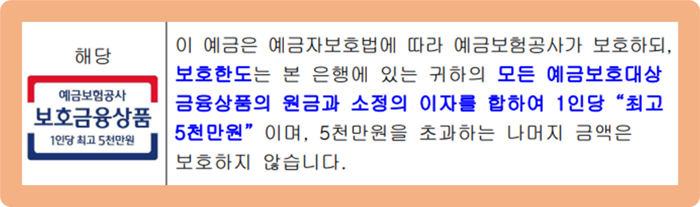 물론 본 상품을 통해서 5천만원까지 예치하려는 분들은 거의 없겠지만, 그래도 소중한 예금이 안전하게 보호된다는 점을 알아두시면 좋을 것 같아요.