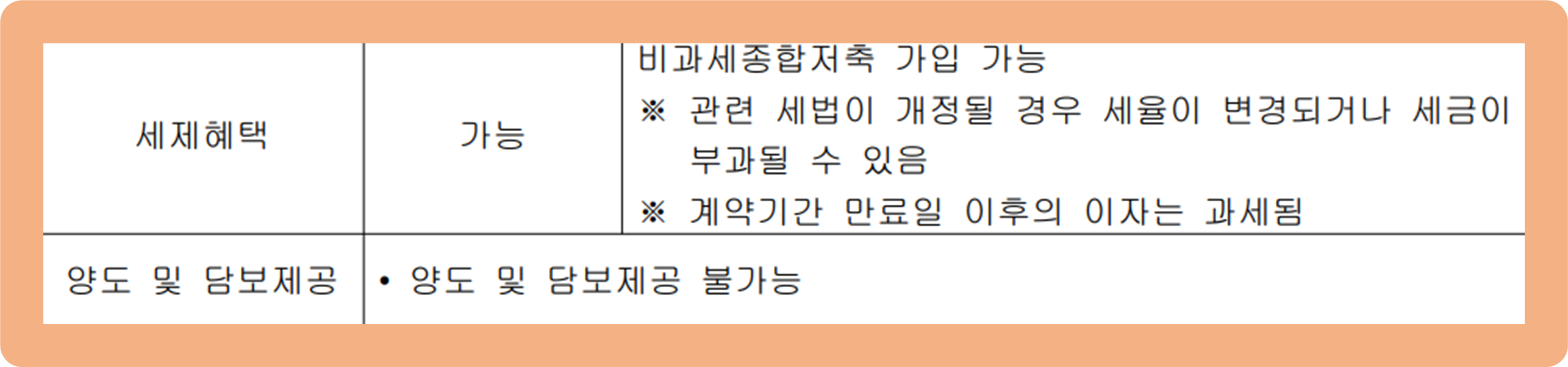 본 상품은 비과세종합저축 가입이 가능해서 비과세 혜택을 받을 수 있어요. 물론, 다른 상품들과 마찬가지로 양도나 담보 제공이 불가능하다는 점 참고해주시길 바랄게요.