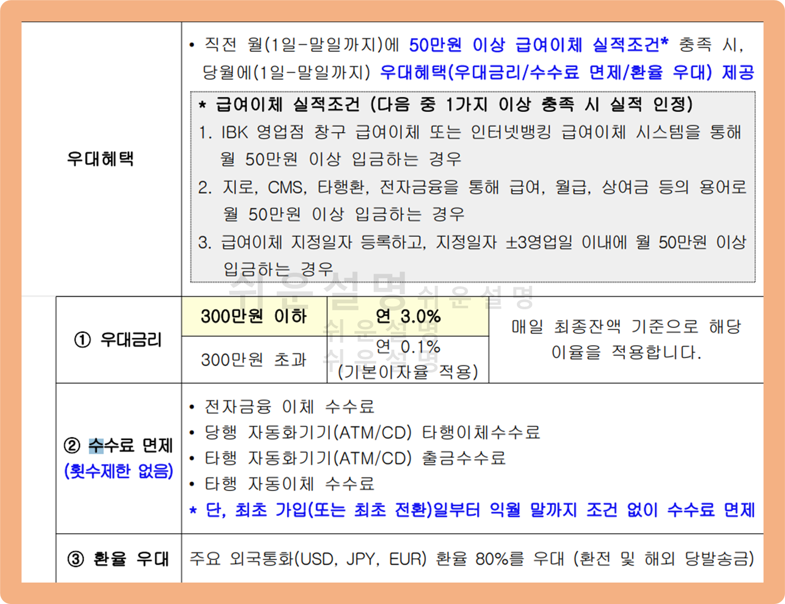 그리고 전월 급여이체 내역이 50만원 이상이면, 3%의 금리 우대 혜택 뿐만 아니라 각종 이체 수수료가 면제되며 환율 80% 우대 혜택도 제공된다는 점 알아두시길 바랄게요.