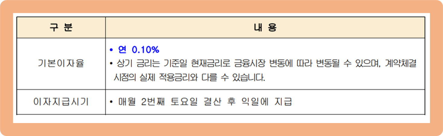 하지만 아쉽게도 금액 제한이 있는데요. 우대 혜택의 경우 예치금액 300만원까지는 연 3%의 금리 혜택을 받을 수 있지만, 300만원이 초과되는 금액에 대해서는 기본 이자율인 연 0.1%의 금리가 적용된다는 것이에요. 그러므로 본 상품을 가입할 경우에는 최대 300만원까지만 예금을 해두는 것이 좋은 방법이죠.