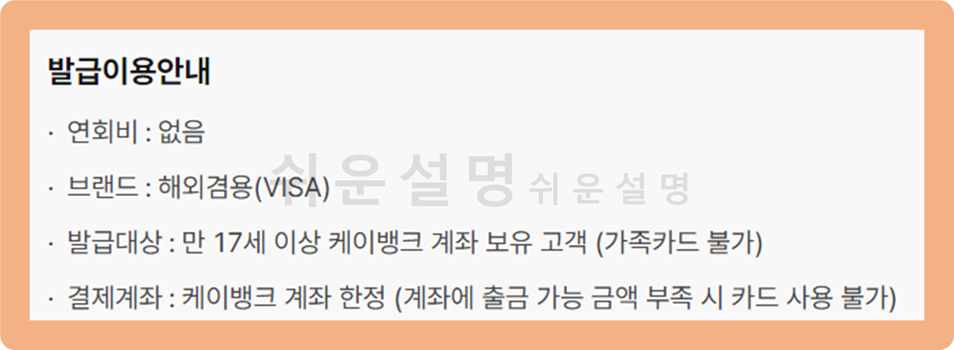 본 상품을 이용할 때 연회비는 발생하지 않으며, 만 17세 이상 케이뱅크 계좌를 보유하신 고객이라면 누구나 발급받을 수 있구요.
