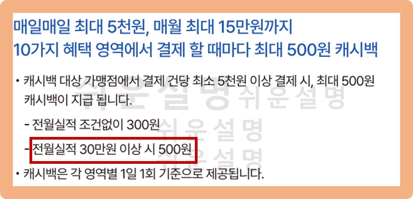 만약 전월 실적 30만원 이상을 달성할 경우에는 건당 500원의 혜택을 받을 수 있게 된다고 해요.